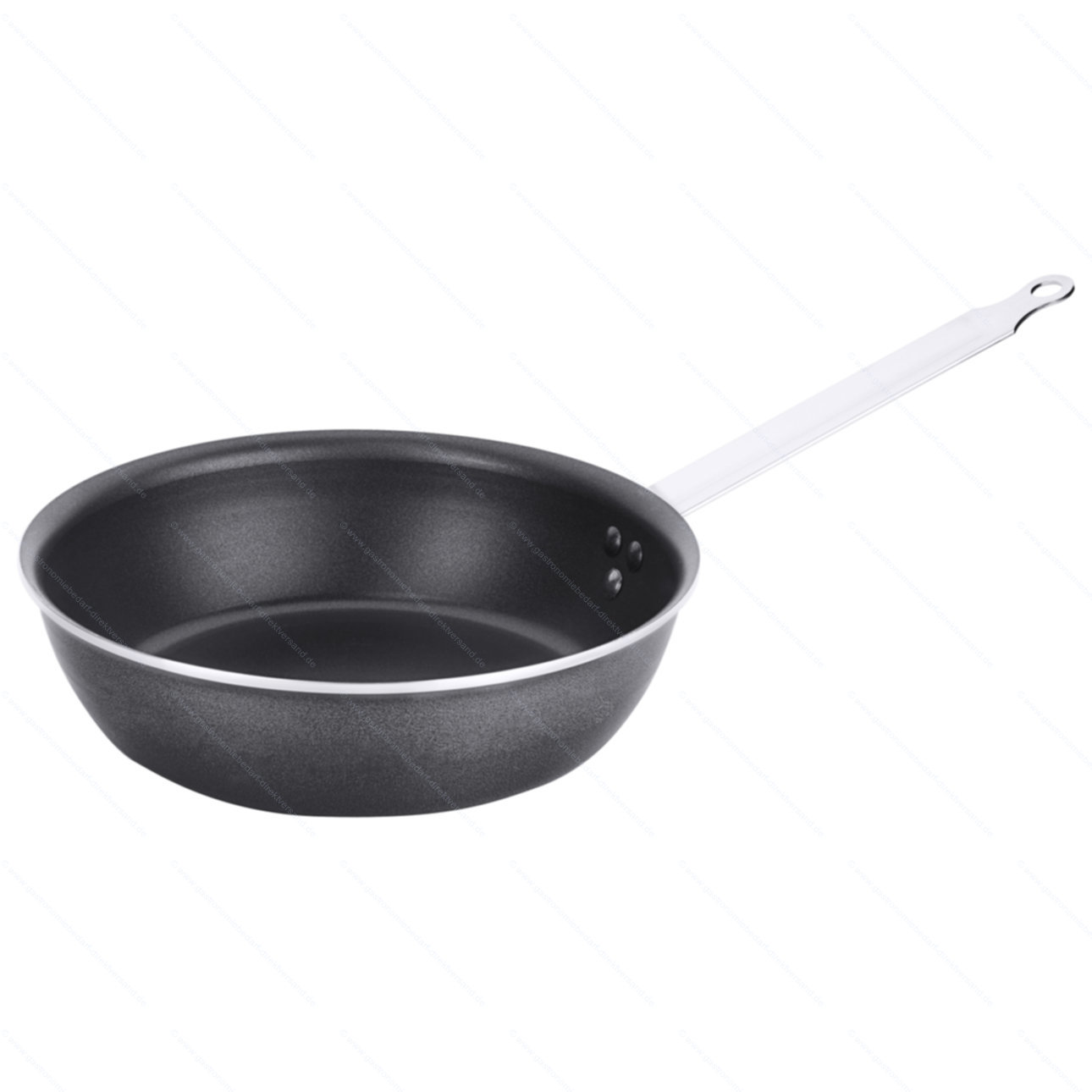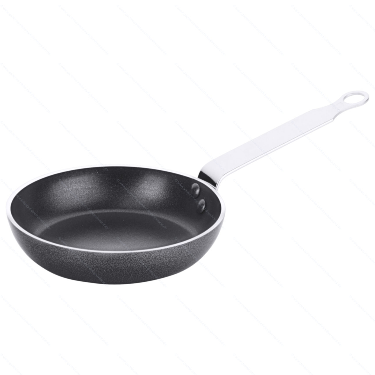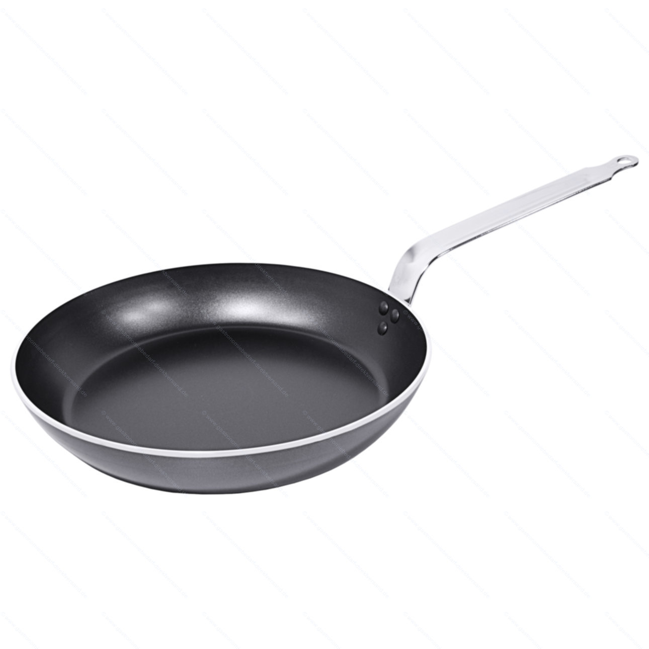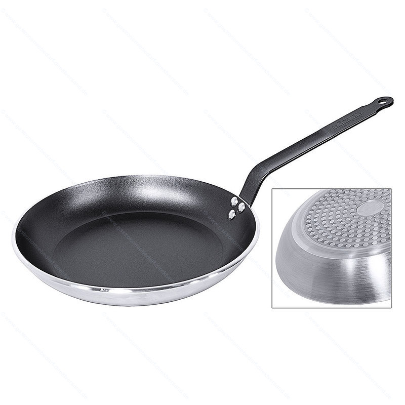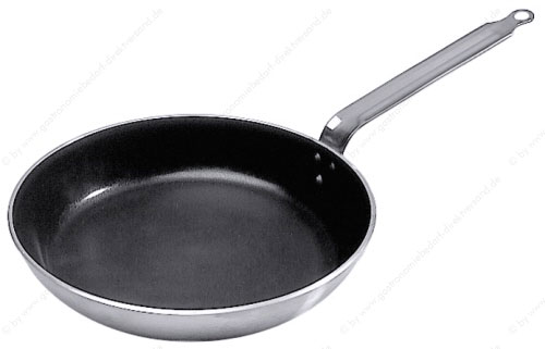 • aus Aluminium mit PTFE-Beschichtung, plangedrehter Boden, Edelstahlgriff zweifach vernietet, extra schwere Qualität