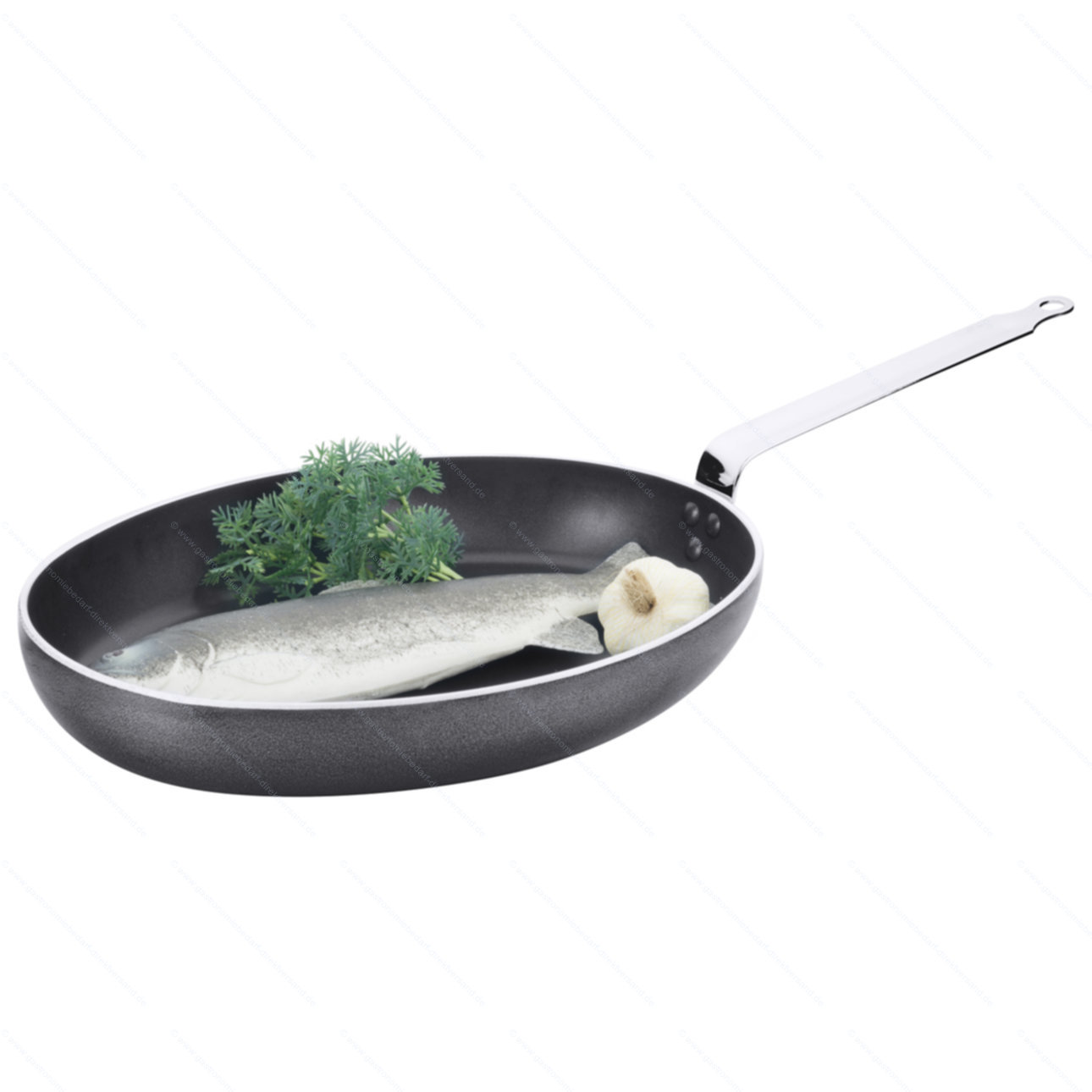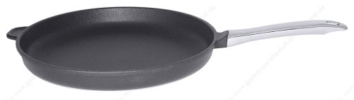 • flache Form, aus handgegossenem Aluminium- Kokillenguss, Antihaftbeschichtung aus Titan-Aluminiumoxyd-Plasma, backofenfest bis +250°C, mit Stiel aus Edelstahl 18/10, nicht induktionsgeeignet, hochwertiges Qualitätsprodukt