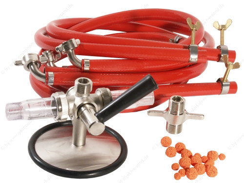 • komplett bestehend aus Gerät, vier 1/2 Zoll Schläuchen (je 1 m) einschließlich einem Druckschlauch, Schwammkugeln, und zwei 5/8 Zoll Adaptern aus verchromten Messing
