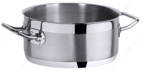 • flache Form, aus Edelstahl 18/10, hochglänzend, mit Kaltgriffen und Schüttrand, 8 mm Sandwichboden, induktionsgeeignet, extra schwere Qualität