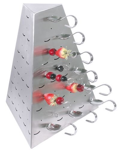 • drei Seiten mit jeweils 21 Aussparungen für Partylöffel und 15 Löchern (3 mm Ø) für Spieße, aus Edelstahl, matt poliert