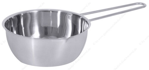 • aus Edelstahl 18/10, hochglänzend, mit Ausgussschnaupe und stabilem Drahtgriff (Ø 4 mm), konkaver Boden um dem Herausspritzen des Fettes durch Bodenauswölbung beim Erhitzen vorzubeugen, schwere Qualität