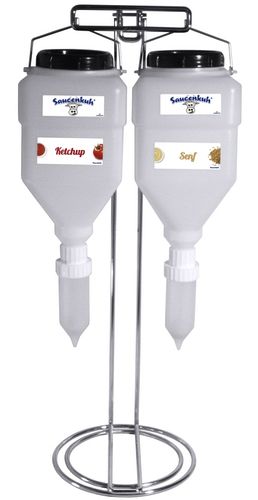 • verchromter Metallständer, zur hygienisch einwandfreien Portionierung von Senf, Ketchup, Mayonnaise oder Dressing durch leichten Fingerdruck