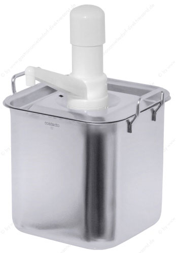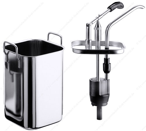 • ganz aus Edelstahl 18/10, selbstansaugende Pumpe, einstellbare Dosiermenge, schwenkbarer Auslaufhahn, thekeneinbaufähig, hitzeresistent bis +70°C, mit Griffen