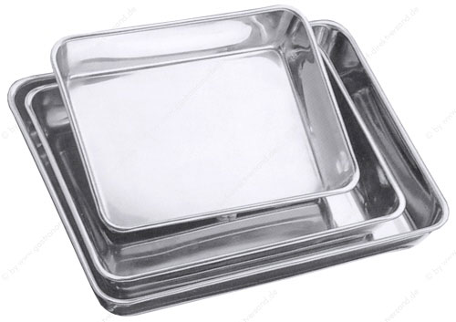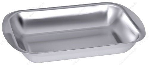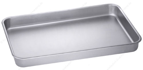 • aus Edelstahl 18/10, seidenmatt poliert, glatt auslaufender Rand, großer Eckradius, vielseitig als Fleischbecken oder Auflaufform verwendbar, mittelschwere Qualität.