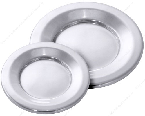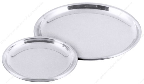 • aus Edelstahl 18/10, hochglänzend, glatte Bodenfläche, als Tablett, Eiskelch- oder Flaschenuntersetzer geeignet, schwere Qualität