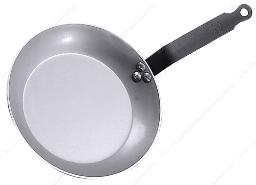 • aus ungeschwärztem Stahl, Materialstärke 2,5 bis 3 mm, gebläuter Flachgriff mit Aufhängeöse, induktionsgeeignet, schwere Qualität