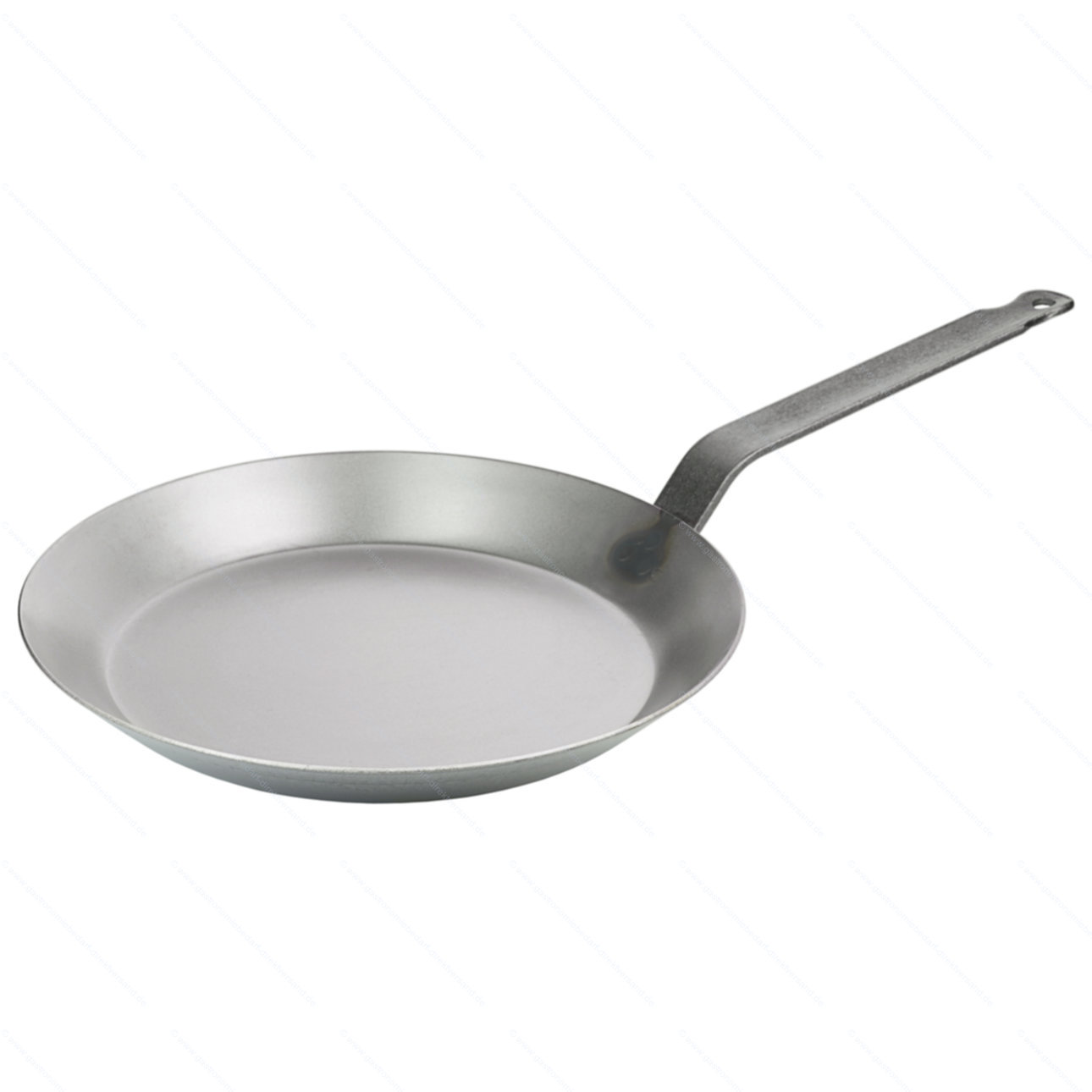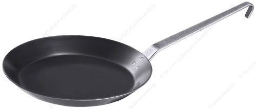 • aus ungeschwärztem flachem Stahl, mit geschmiedetem Hakengriff, induktionsgeeignet, schwere Qualität