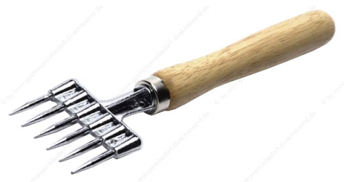 • hochglanzverzinnt, mit hellem lackiertem Holzgriff, mit sechs Zinken