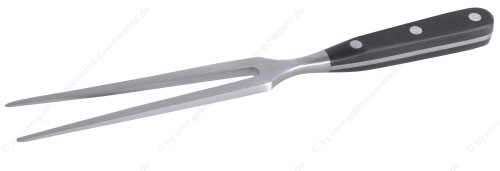 • geschmiedete Zinken aus Klingenstahl X30Cr13, vernieteter und verschweißter Griff aus schwarzem Melamin, mit Edelstahlnieten, spülmaschinenfest, schwere Qualität