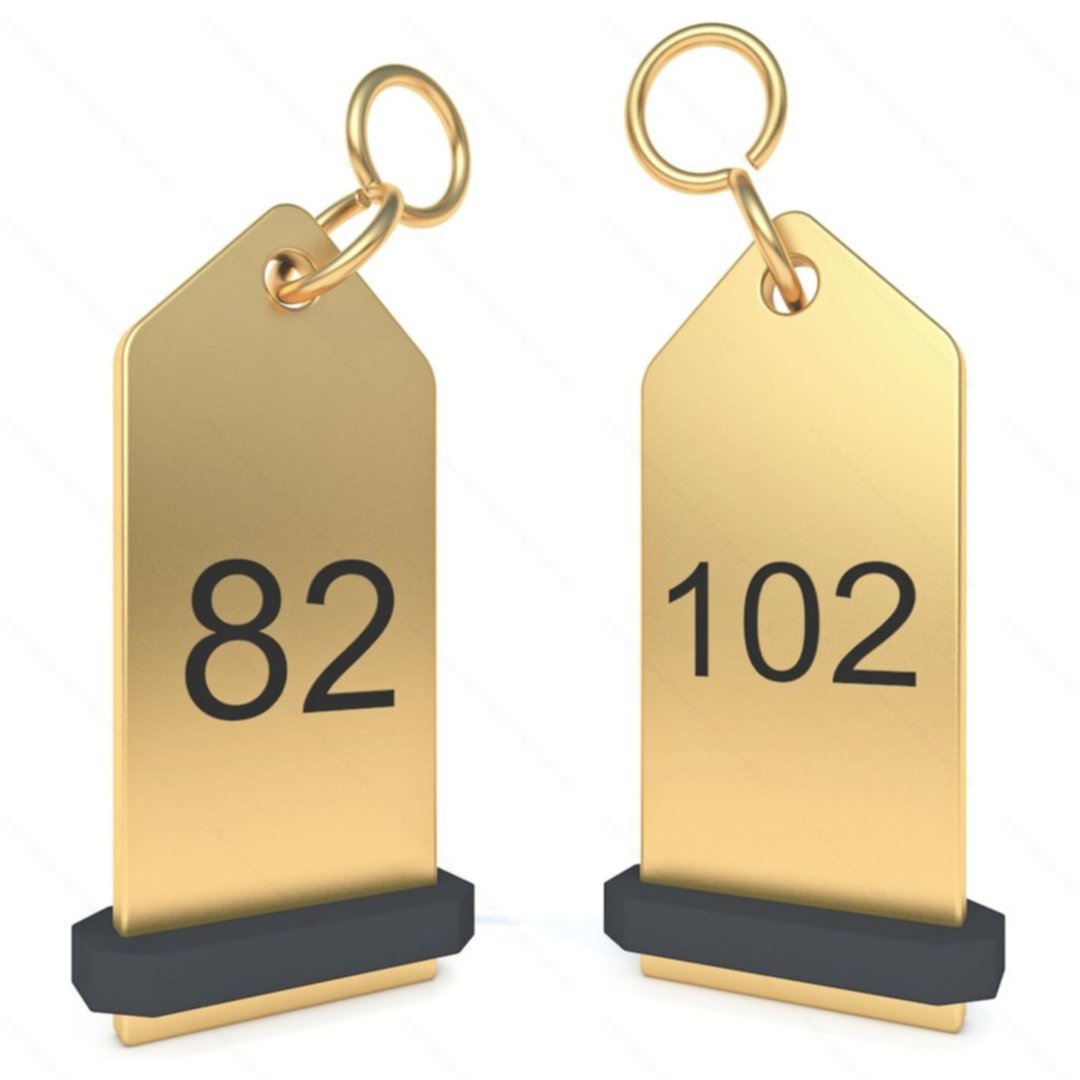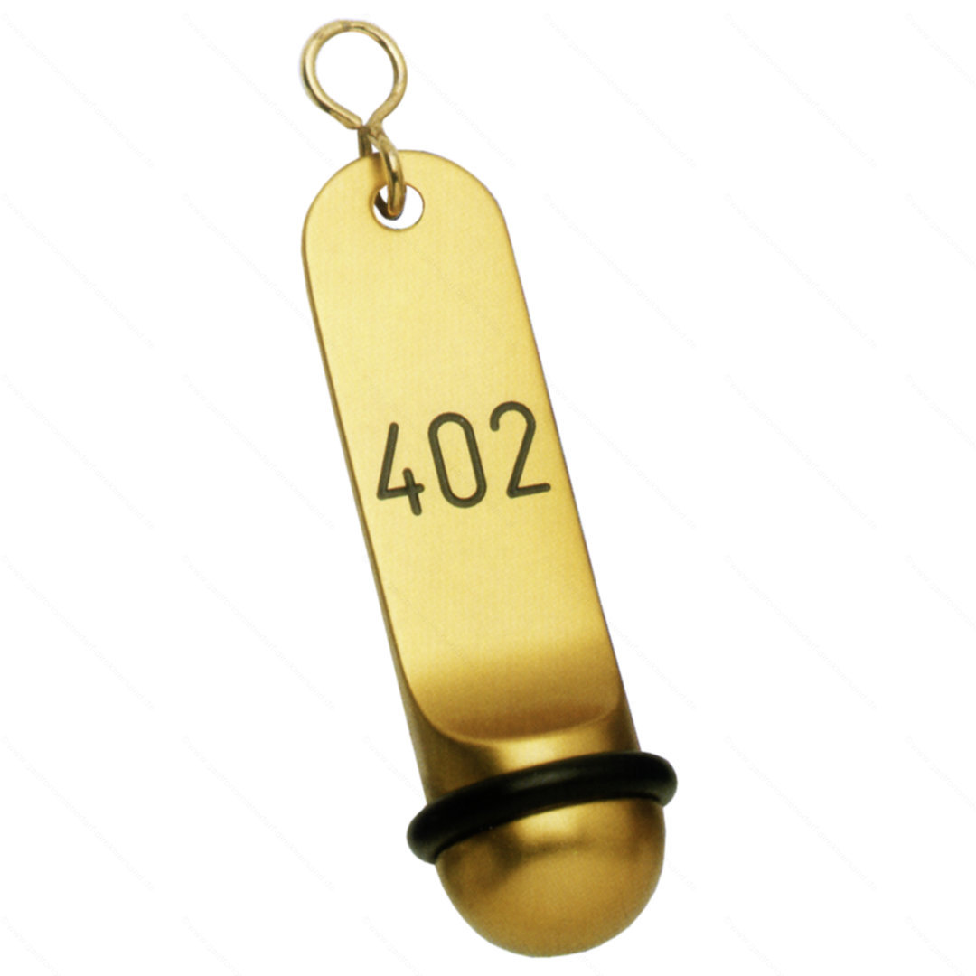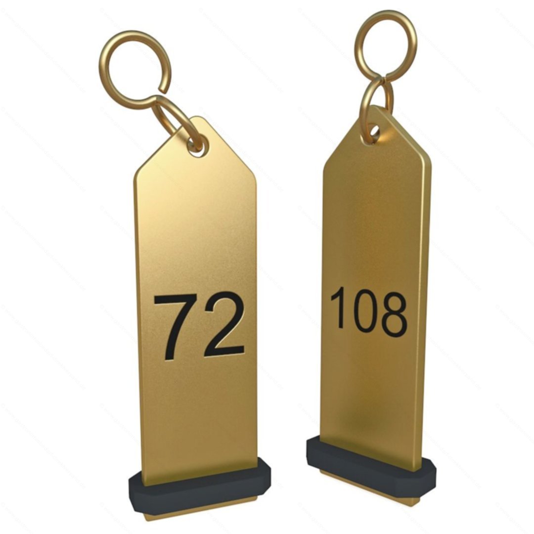• aus goldfarbenen eloxiertem Leichtmetall, mit schwarz ausgelegter Gravur, mit S-Haken und Schonring, alle Nummern bis maximal drei Ziffern verfügbar, Lieferung einseitig graviert (auf Anfrage auch silberfarben, beidseitig beschriftet und mit Hotelnamen lieferbar)