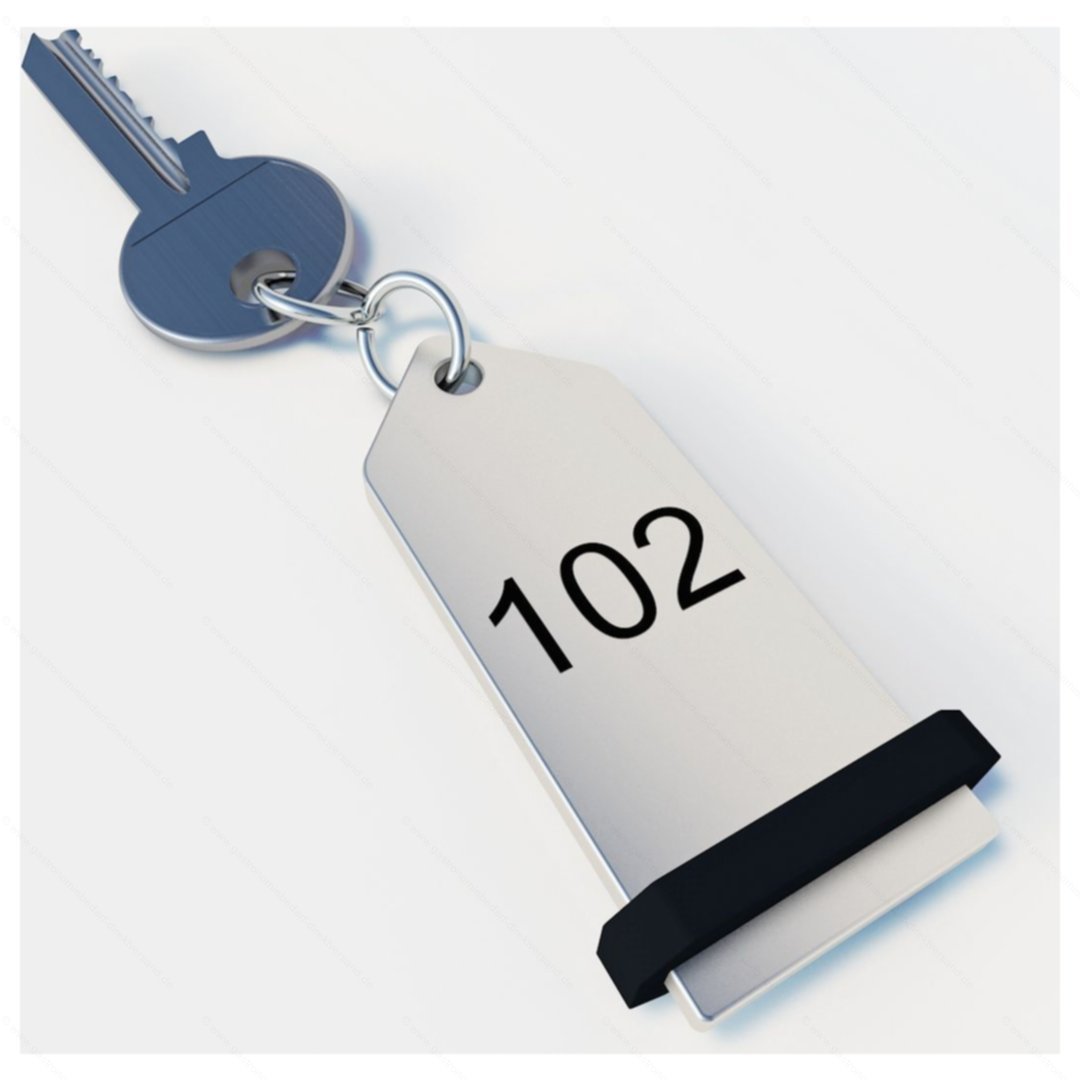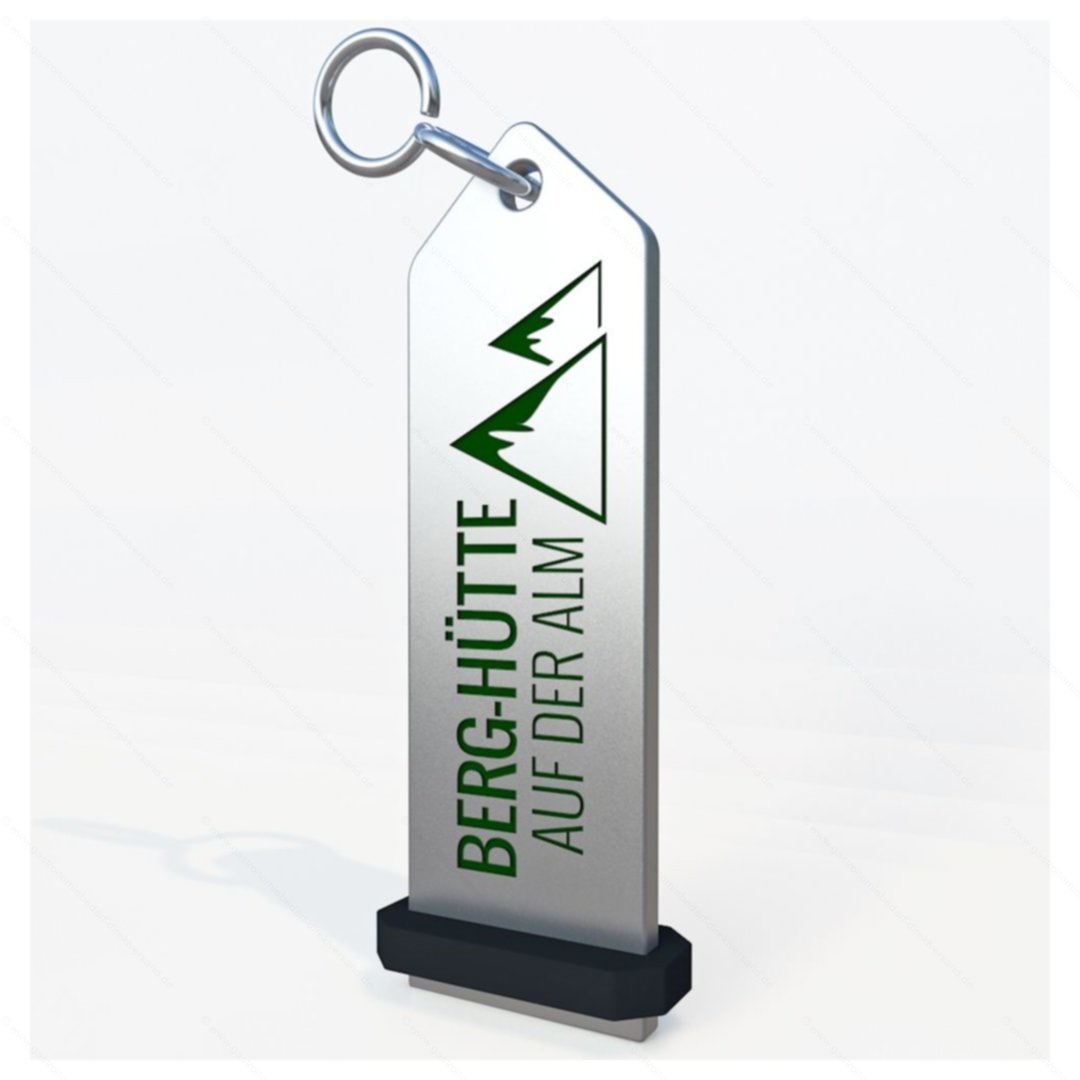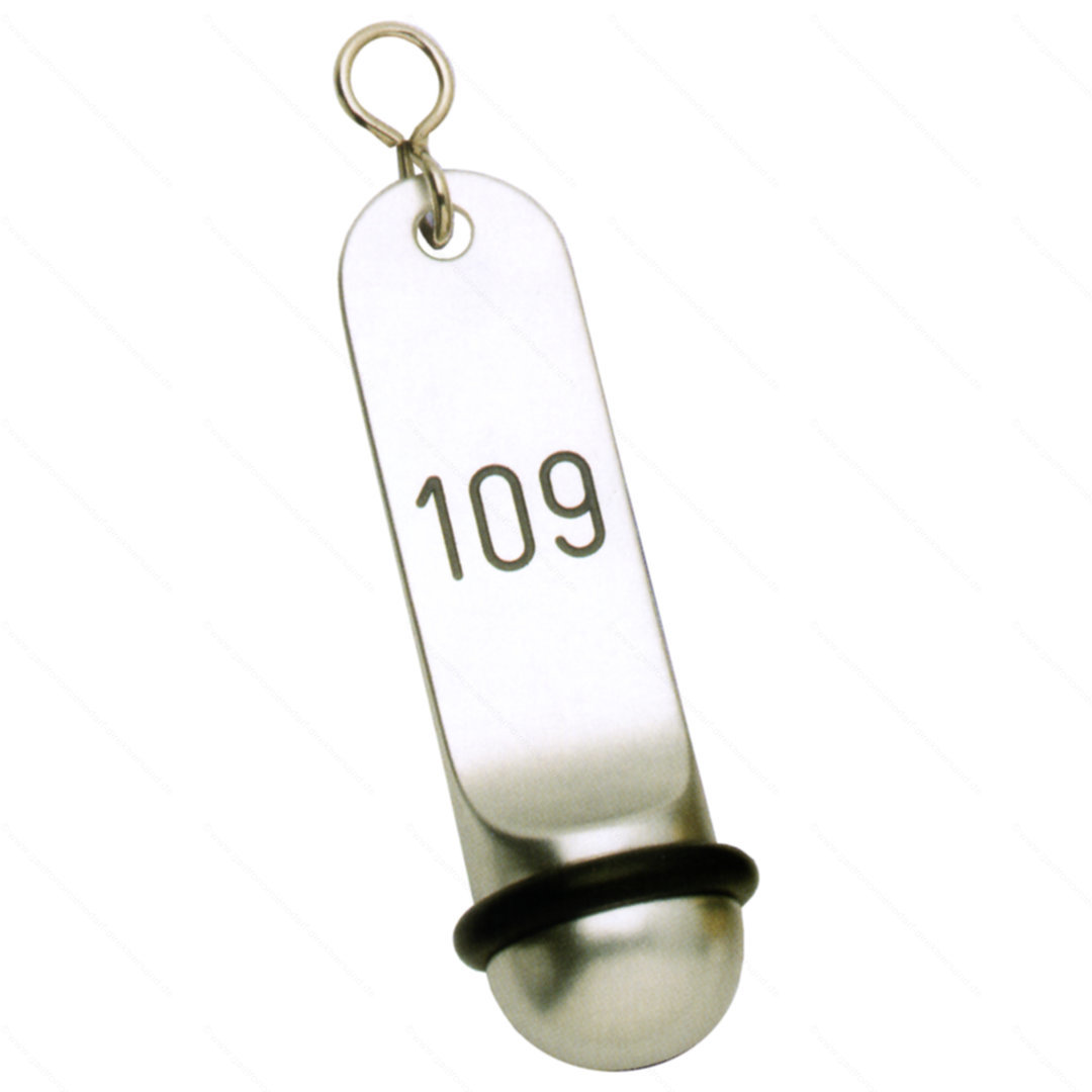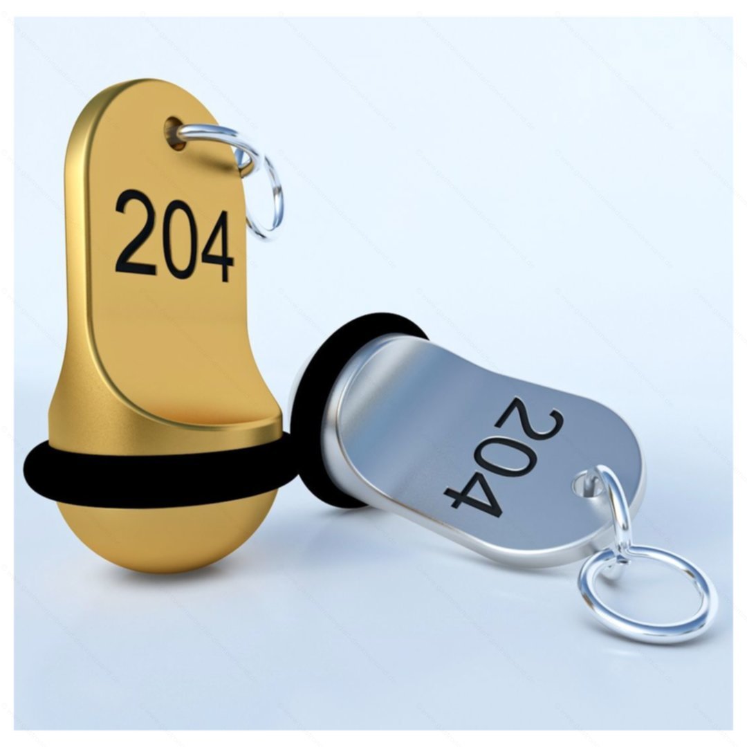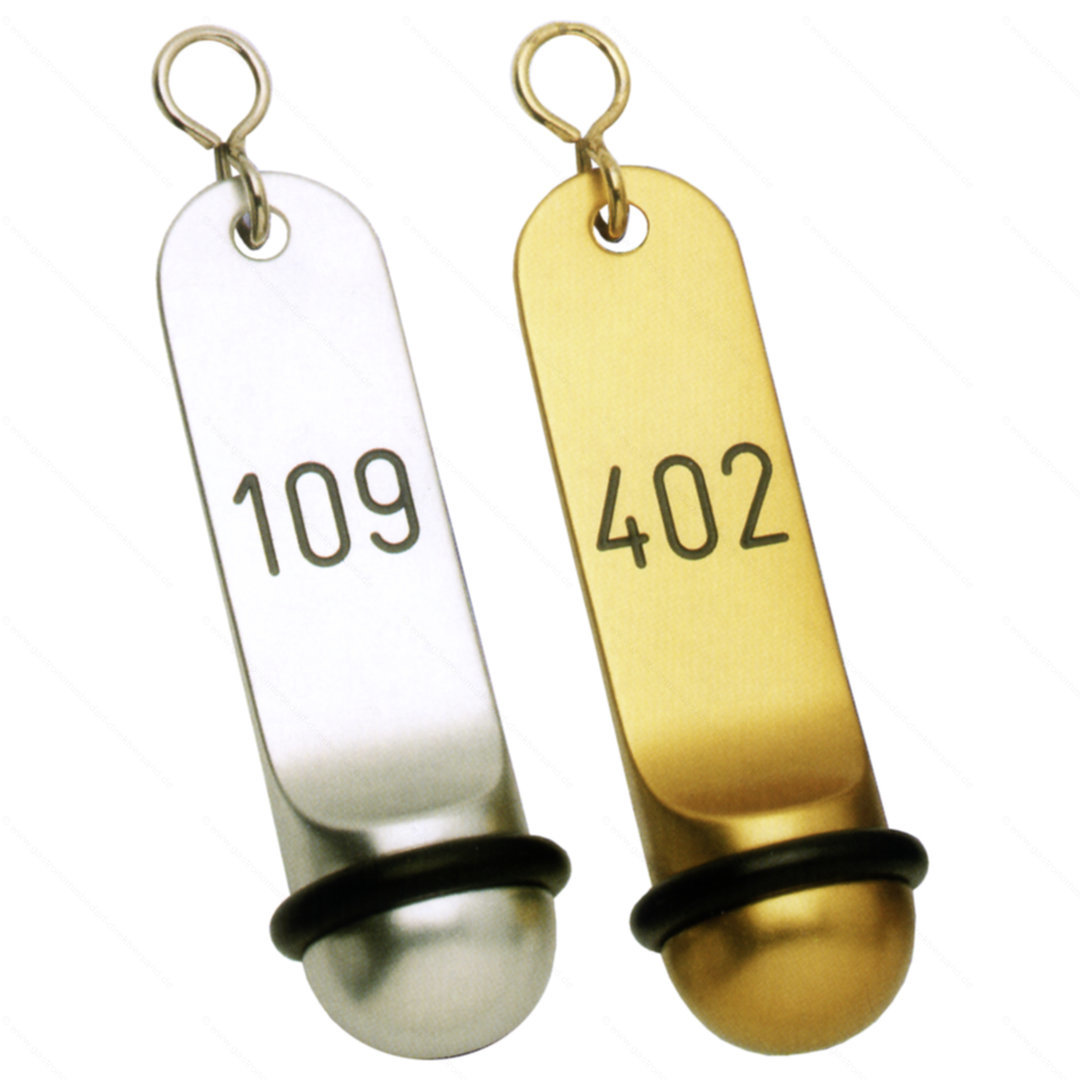 • klassische Form, aus eloxiertem Leichtmetall, Farbe: silber oder gold, mit schwarz ausgelegter Gravur, mit S-Haken und Schonring, bis maximal drei Ziffern alle Nummern verfügbar, Lieferung einseitig graviert, auf Anfrage beidseitig und mit Hotelnamen lief