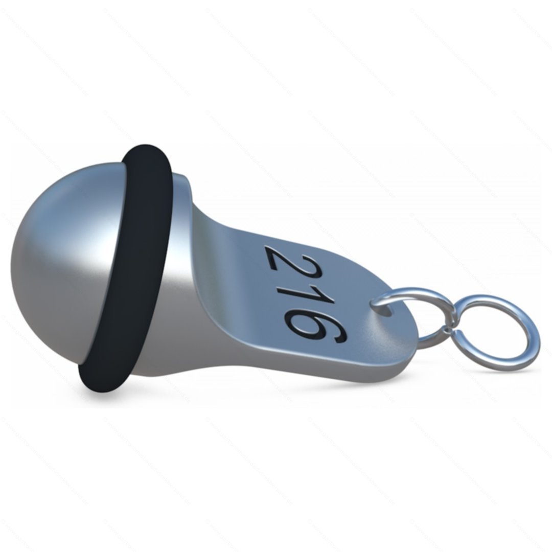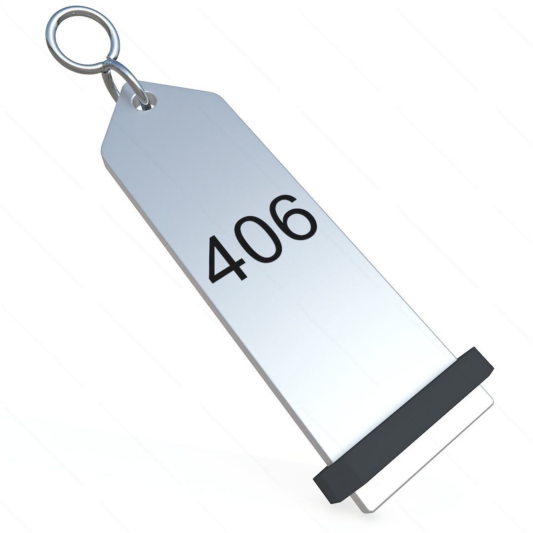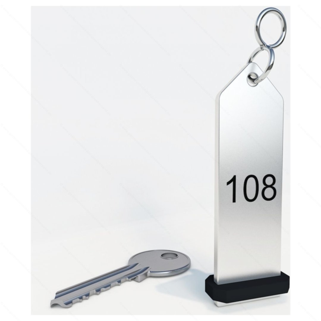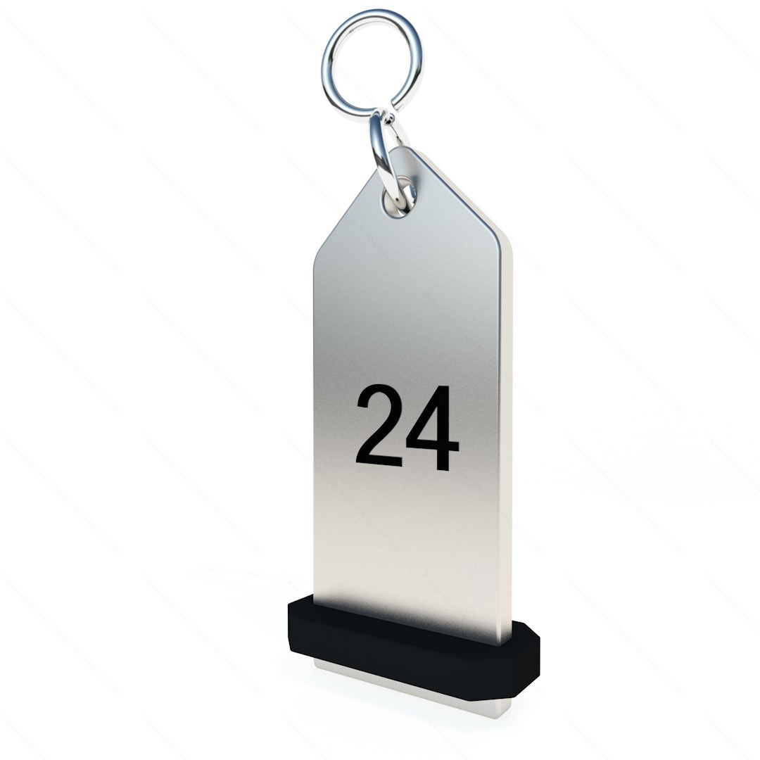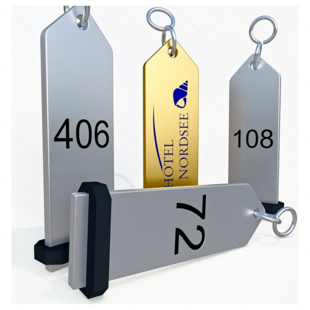 • aus silberfarbenen eloxiertem Leichtmetall, mit schwarz ausgelegter Gravur, mit S-Haken und Schonring, alle Nummern bis maximal drei Ziffern verfügbar, Lieferung einseitig graviert (auf Anfrage goldfarben, beidseitig beschriftet und mit Hotelnamen lieferbar)