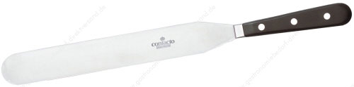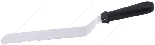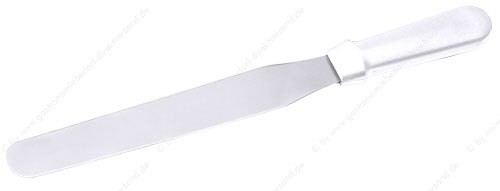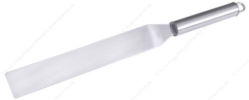 • aus Edelstahl, seidenmatt poliert, mit ABS-Griff, mit 90° gekröpftem Spatel, zum Abstreichen überschüssiger Teigmasse vom Tortenring u.a.
