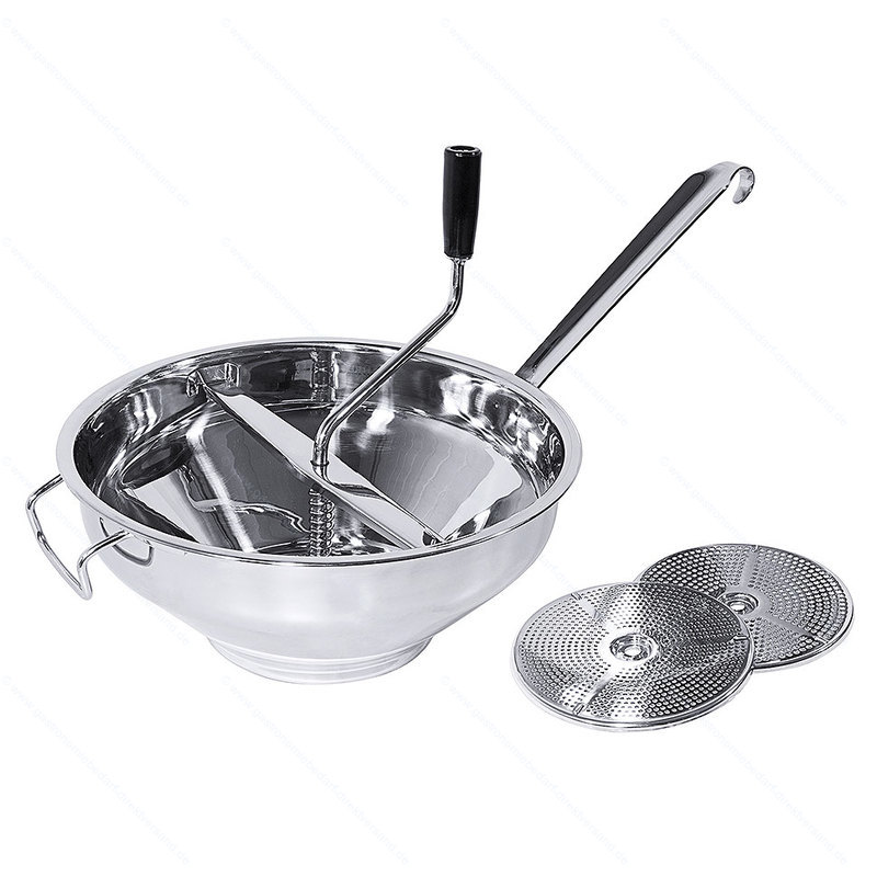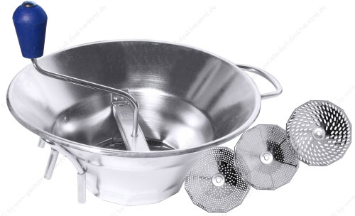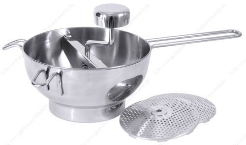 • aus Edelstahl 18/10, außen hochglänzend, mit Doppelflügeltechnik mit drei auswechselbaren Sieb-Einsätzen (Ø 13 cm), geeignet für Topf-Ø 14-16 cm, schwere Qualität