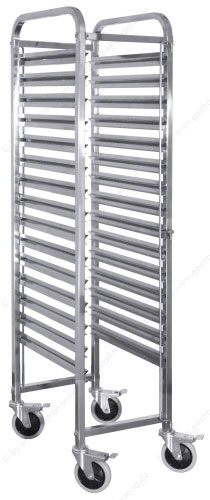 • aus Edelstahl, 15 Doppelauflageschienen nach DIN 18867-2 mit beidseitiger Kipp- und Durch- schubsicherung zum Transport von bis zu 30 GN-Tabletts oder 15 GN-Behältern bis GN 1/1 (Längseinschub) bei einem Stapelabstand von 75 mm, mit 4 Lenkrollen Ø 125 mm alle mit Feststellern