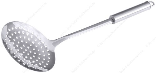 • aus Edelstahl 18/10, seidenglänzend poliert, flache Form, mit angesetztem Stiel (Rohr-Ø 34 mm), mit 3,5 mm Lochung, schwere Qualität