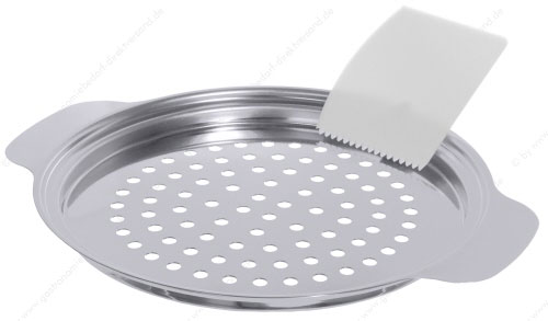 • aus Edelstahl 18/0, Führung aus schwarzem Kunststoff, matt poliert, runde Lochung für kurze bayrische Knöpfle, für Topfdurchmesser von Ø 20 cm bis 28 cm geeignet