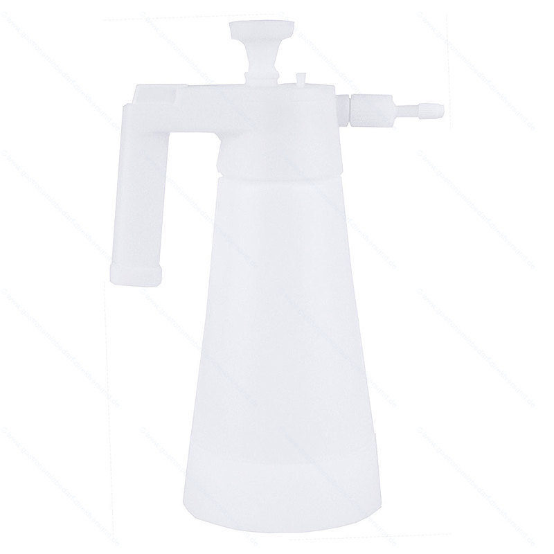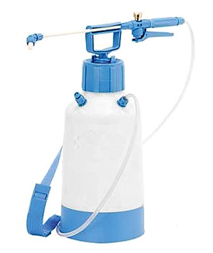 • aus weißem lebensmittelgeeigneten Polyethylen, für dünnflüssige Lösungen (kein Öl), mit Handpumpe zum Aufbauen von maximal 0,2 MPa (2 bar) Arbeitsdruck, mit verstellbarer Düse, Sicherheitsventil und Standfuß