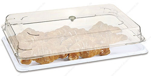 • aus glasklarem Polycarbonat mit verchromtem Griff, passt auf alle GN-Tabletts, mit Öffnung an Längsseite, bis +65°C einsetzbar, sehr robuste Qualität, nahezu unzerbrechlich