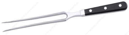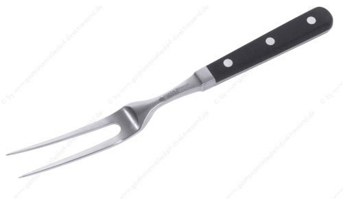 • mit gebogenen Zinken aus geschmiedetem Chrom-Molybdän-Vanadium, (DIN x50CrMoV15), vernieteter und verschweißter Griff aus POM-Kunststoff, spülmaschinenfest, schwere Profiqualität. Ideal auch zum Wenden von Bratgut in der Pfanne.