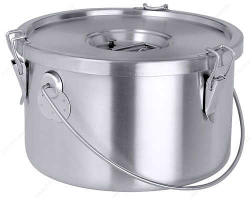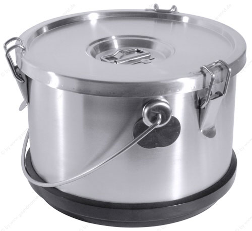 • mit Gummischutzring, aus Edelstahl 18/10, doppelwandig, seidenmatt gebürstet, mit Tragebügel, ohne Kompensboden, Deckel mit Silikondichtung und mit drei Spannverschlüssen, Überdruck kann durch Ventil entweichen, schwere Qualität