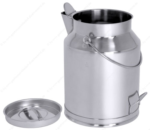 • aus Edelstahl 18/10, seidenmatt glänzend, mit Deckel, Ausgussschnaupe, Bodenring, Tragebügel und Griff, extra schwere Qualität