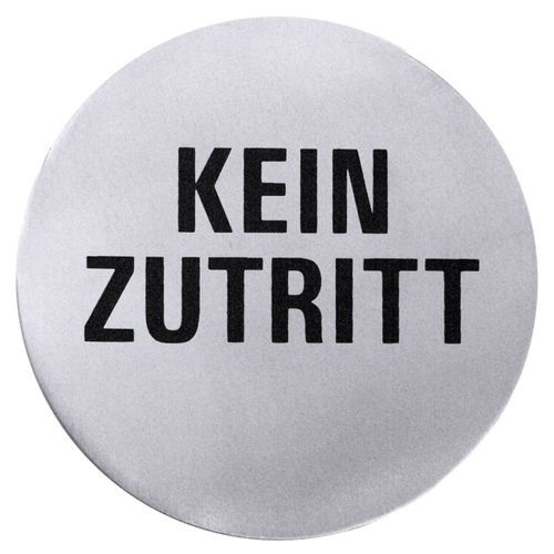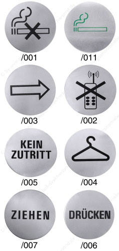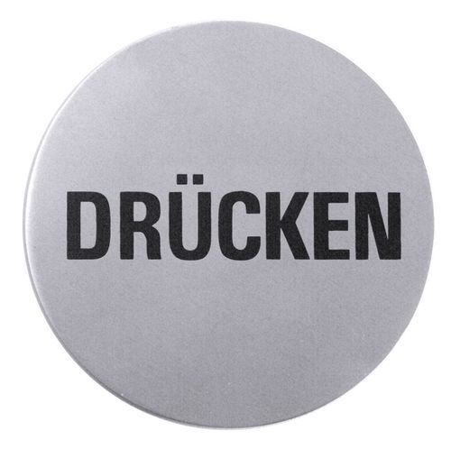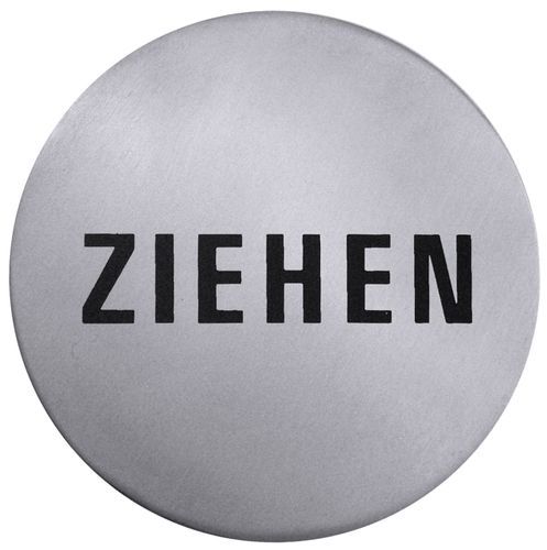 • aus Edelstahl 18/10, seidenmatt poliert, 7,5 cm Durchmesser, Materialstärke 1 mm, Text aus schwarzem Siebdruck, selbstklebende Rückseite
