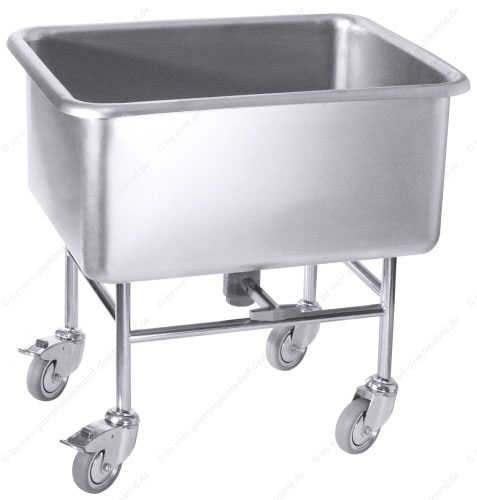 • aus Edelstahl 18/10, Materialstärke 1,25 mm, mit Edelstahl 18/10-Untergestell, mit 4 Lenkrollen Ø 125 mm, davon 2 mit Feststellern, 1¼ Zoll-Ablaufventil aus Nylon, Beckentiefe: 29 cm