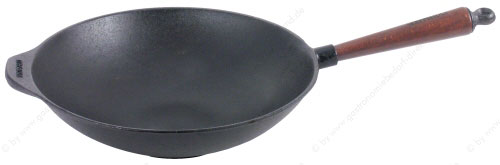 • aus Gusseisen, mit abgeflachtem Boden, mit edlem Buchenholzgriff, schwere, hochwertige Qualität